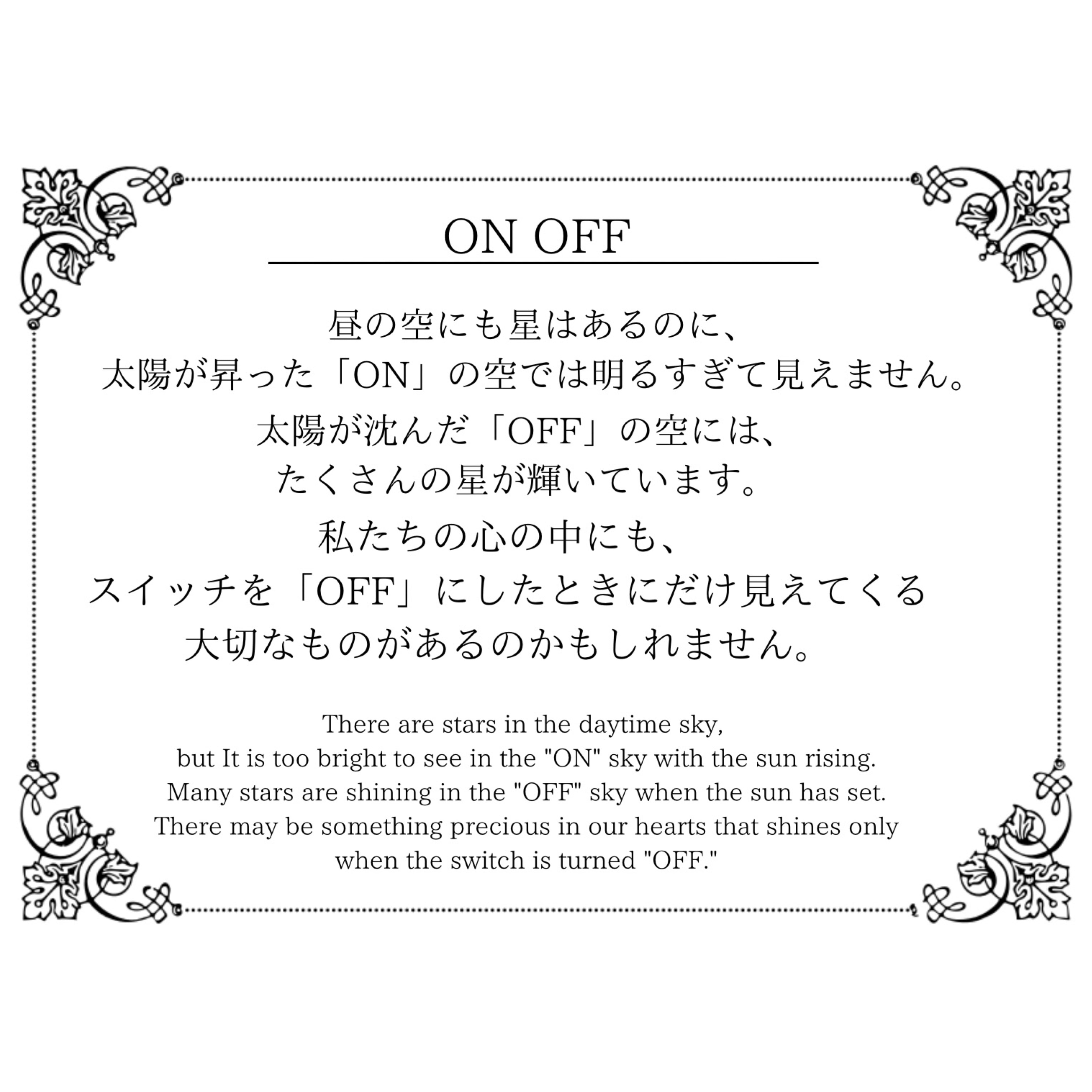 私たちの心の中にも、スイッチを「OFF」にしたときにだけ見えてくる大切なものがあるのかもしれません。